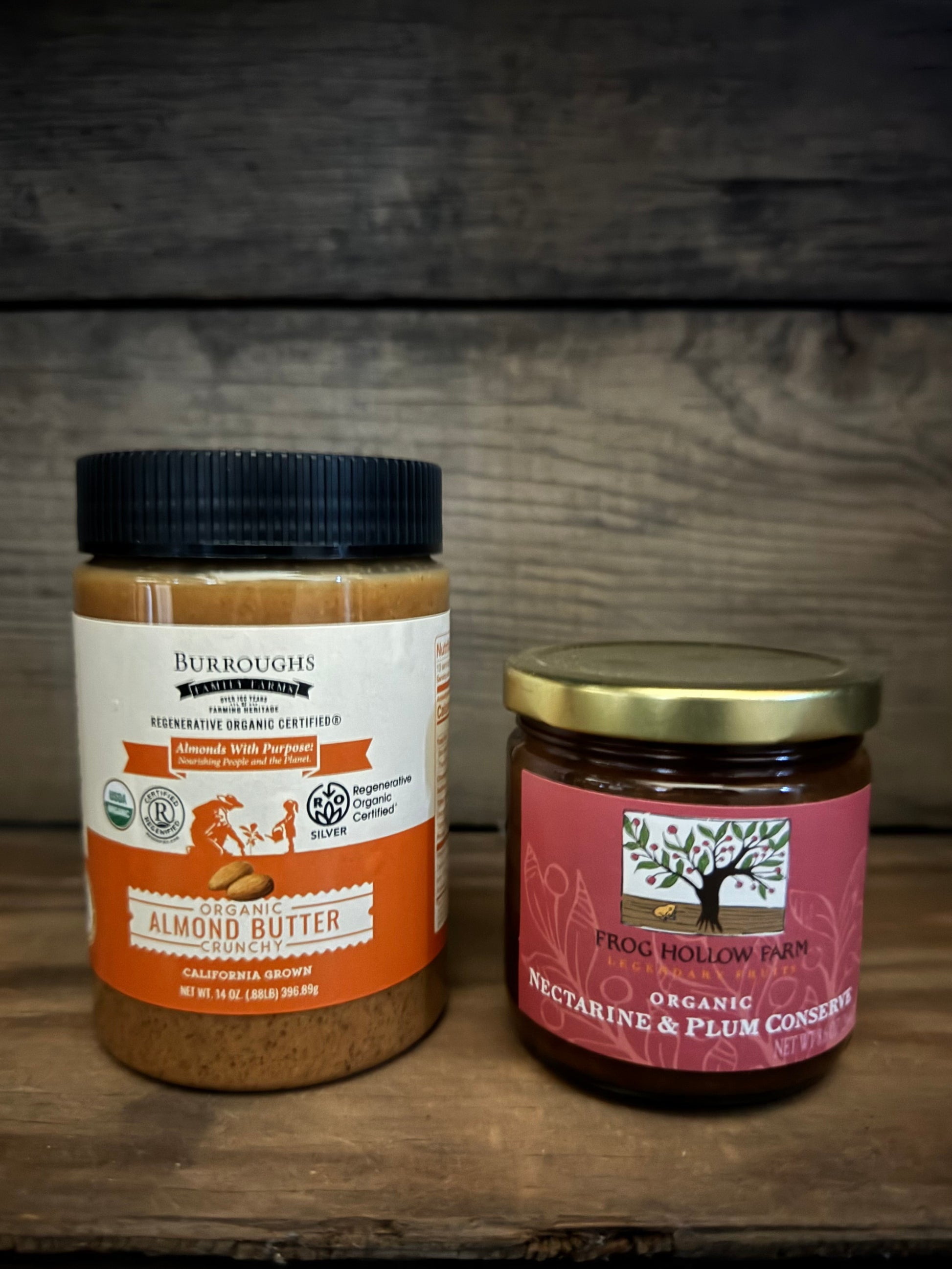 Indulge in the perfect harmony of flavor and sustainability with our delicious duo featuring your choice of Frog Hollow Farm organic jam or Naturacentric artisan honey, paired with Burroughs Family Farms Regenerative Organic Almond Butter.